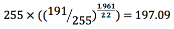 To recap, if you take the 75% grey bar and perform the 1.96 to 2.2 gamma conversion, the calculations are as follows: 191/255 (75% grey bars in an 8-bit (0-255) RGB space have 191 energy levels, because 191 is 75% of 255), raised to the 1.961/2.2 exponent (gamma conversion), scaled back to 255, producing a value of approximately 198: