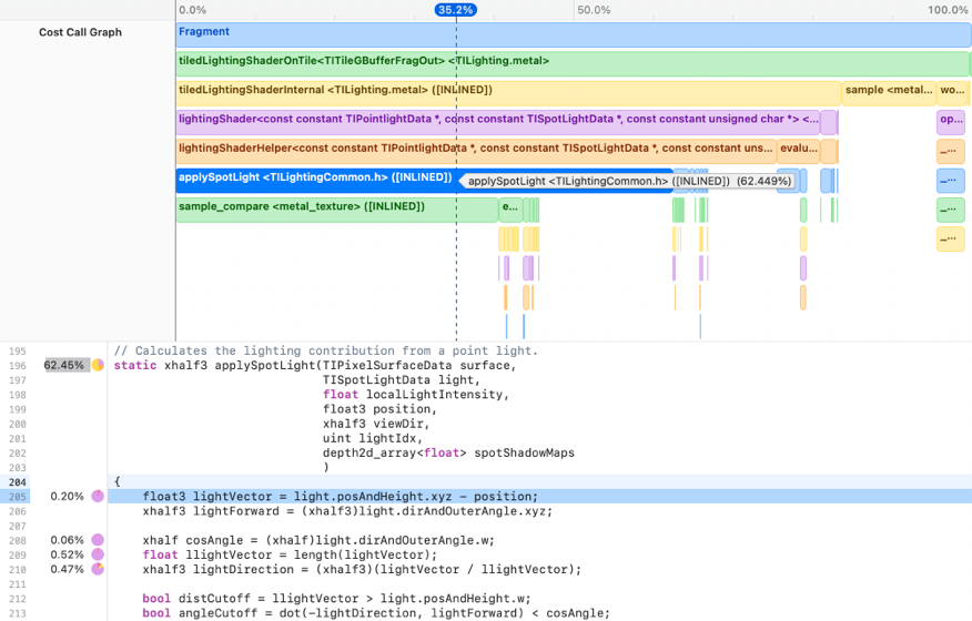 The Metal debugger visualizes shader function cost, and shows inline statistics within your shader source, making optimizing your code a breeze. You can even edit and reload your shaders to compare performance.