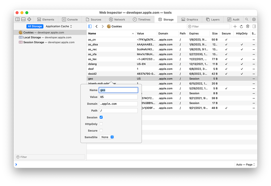 Storage. Find details about the data stored by a web page, such as application cache, cookies, databases, indexed databases, local storage, and session storage.