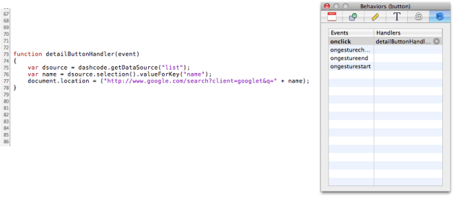 On the canvas, select the button you added to the detail page. In the Behaviors inspector, double-click in the Handlers column next to the onclick event name. Enter the name of a new function, such as detailButtonHandler, and press Return. If you don’t already see it, click the arrow next to the function name you entered to reveal the source code editor below the canvas. Clicking the arrow reveals the detailButtonHandler function Dashcode inserted in your web application’s code (specifically, in the main.js file).