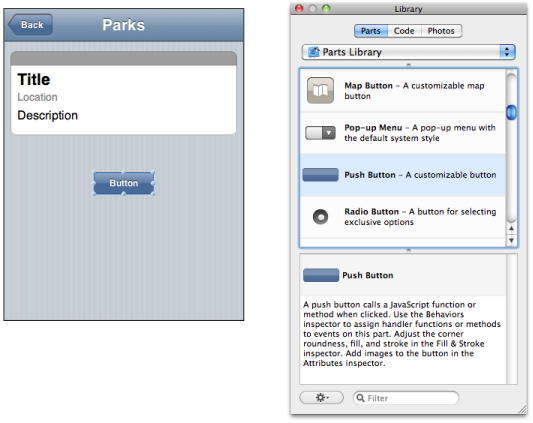 To find the appropriate button part, choose Window > Show Library and click Parts. Scroll through the list of parts until you find the Push Button part, and drag this part into your detail page on the canvas.