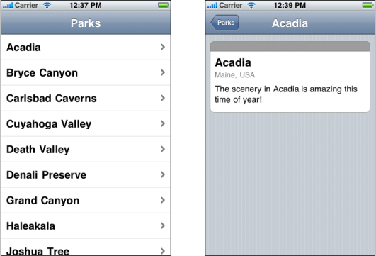 Figure 2-2  The default Browser-based mobile Safari web application contains a top-level page (left) and a detail page (right)