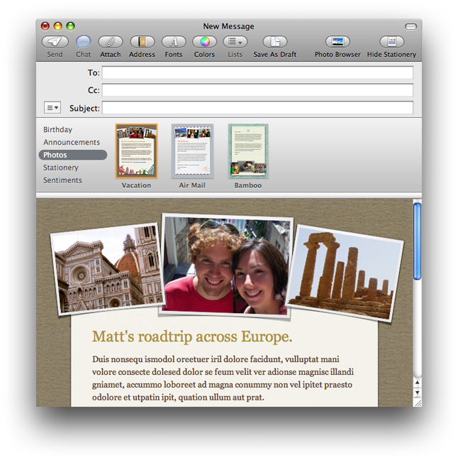 Mail Stationery is a new feature in Mac OS v10.5 that allows users to customize their email messages with predefined stationery templates. Each stationery template is a bundle that contains all the files needed to display the stationery.