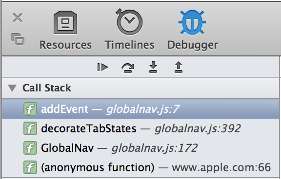 After one or more breakpoints are set, reload your page. Breakpoints retain their position across page loads, so your breakpoints won’t be lost. As soon as Safari’s JavaScript interpreter reaches a line of code that has a breakpoint on it, JavaScript execution halts, and the Scope Chain details sidebar appears. The Scope Chain contains a snapshot of variables available to the scope of the paused line, as well as their current values. For further information about the Scope Chain details sidebar, continue to Scope Chain.