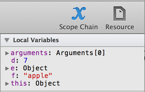 There are two variables that appear in the local variables section that you don’t declare explicitly: arguments and this. The arguments variable contains the values of the arguments that were passed into this function, including the implicitly available event object. this refers to the object this function is a member of (either the object that this method is attached to, or window).