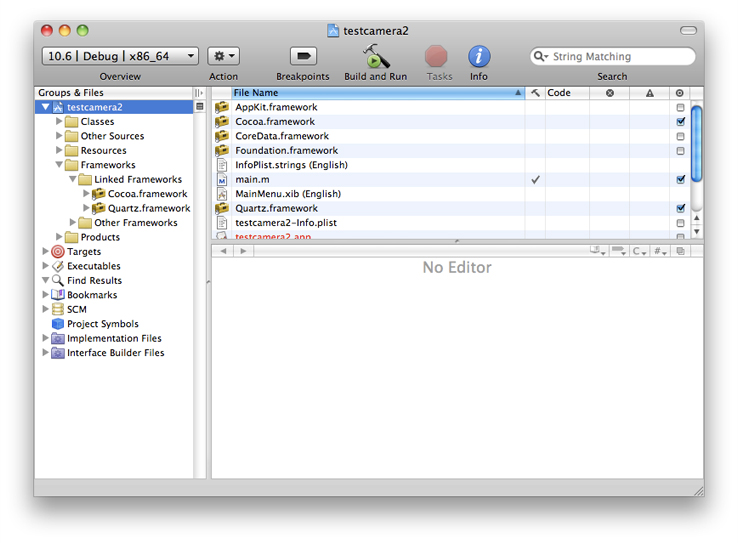 Launch XCode (\Developer/Applications/Xcode), choose Create a new Xcode project, then choose Cocoa Application. Give your project a name, add the Quartz.framework, and save it. Xcode automatically creates necessary files such as main.m and MainMenu.xib. Your project should look much like Figure 2-1.