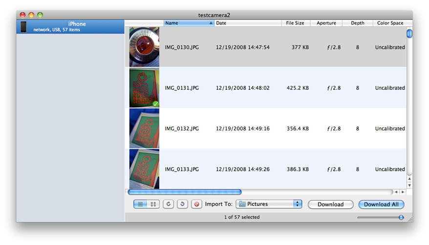 When you add or remove cameras, the browser view updates to show the changes. Select a device and you can view its contents and download images. You can download to a folder, directly to an application, or to an Applescript. You can select a list view or a matrix view of the thumbnails. You can control the thumbnail size with the provided slider. You can also rotate or or delete images using the buttons provided.