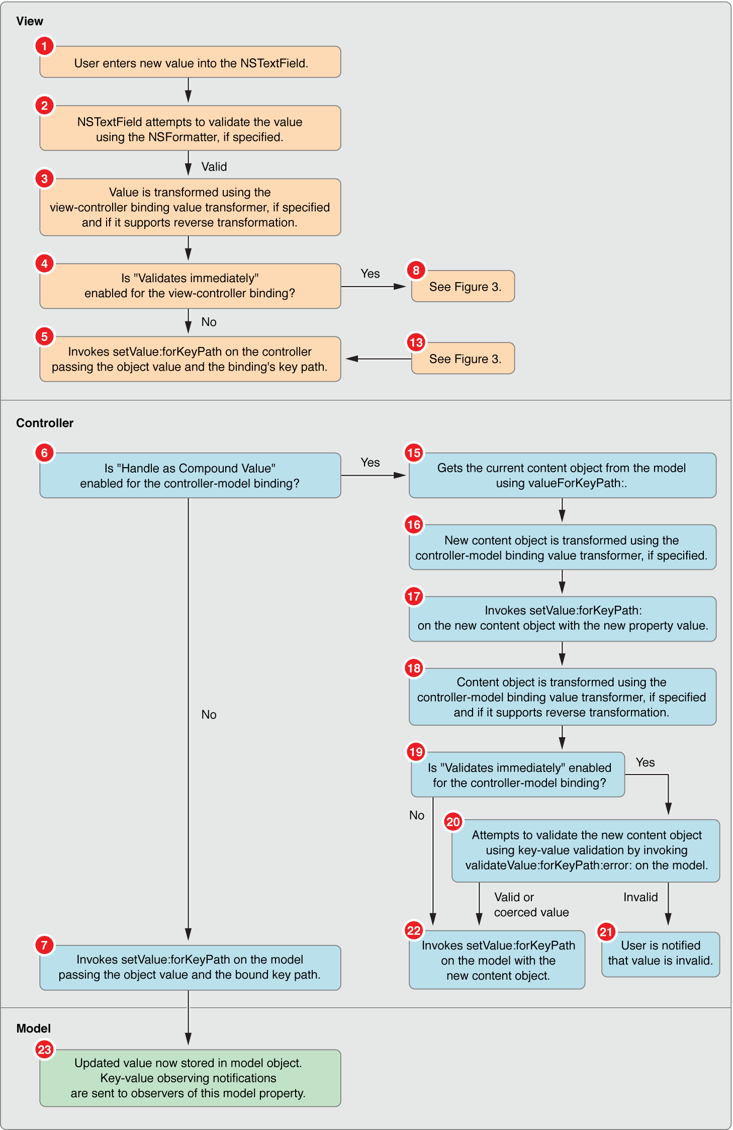 A binding has a number of possible options that can be configured, and many of these will influence the flow of messages between the controller, view and model objects. Value transformers, NSFormatters, key-value validation, placeholders, selection value markers, and other binding options, all affect changes made in the user interface, and in the model values. This article describes the flow of messages between the objects for common interactions with the view, controller, and model objects.