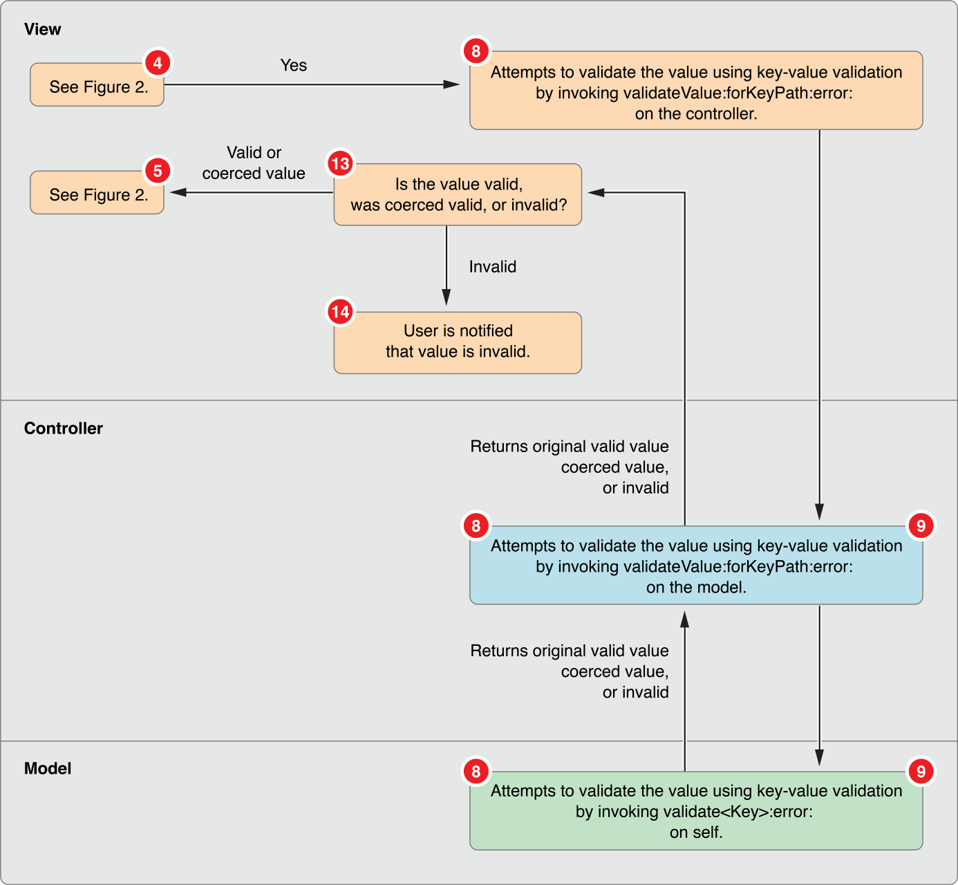8. The view attempts to validate the value from Step 4 using key-value validation. It does this by invoking validateValue:forKeyPath:error: on the controller, passing the proposed value, the binding’s key path, and an NSError pointer reference as arguments.