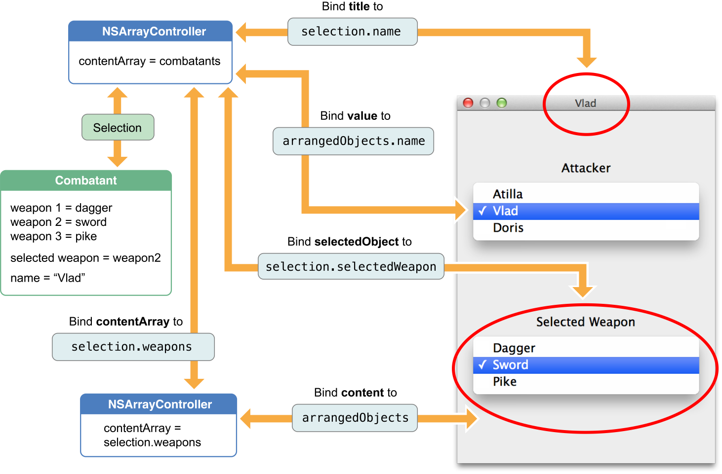 Figure 13 illustrates how the user interface of the Combatants application can be implemented using bindings. The table view is bound to an array controller that manages an array of combatants. The window title is bound to the name of the selected combatant. The pop-up menu retrieves its list of items from an array controller bound to the attacker’s weapons “array,” and its selection is bound to the attacker’s selected weapon.
