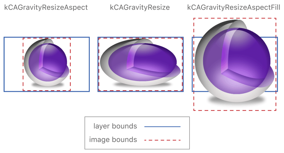 When you assign an image to the contents property of a layer, the layer’s contentsGravity property determines how that image is manipulated to fit the current bounds. By default, if an image is bigger or smaller than the current bounds, the layer object scales the image to fit within the available space. If the aspect ratio of the layer’s bounds is different than the aspect ratio of the image, this can cause the image to be distorted. You can use the contentsGravity property to ensure that your content is presented in the best way possible.