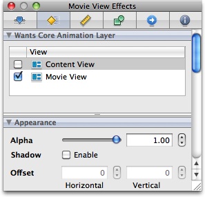 Technically, layer-backed views use Core Animation layers as their backing store. Enabling layer-backing for the view (and its descendants) in this particular code sample is accomplished via Interface Builder by setting the Wants Core Animation Layer check box on the Movie View in the Movie View Effects Inspector Panel (shown in Figure 1-10).