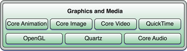 To better understand these frameworks, you can view their implementation depicted graphically as a set of layers, shown in Figure 1-1. Each layer provides a progressively more powerful and sophisticated collection of application services. The graphics and media layer implements a number of specialized services for playing audio and video media content and for rendering 2D and 3D graphics.