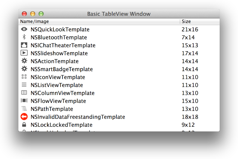 Constructing this simple table view required no subclassing to display the content; both cell views are instances of the NSTableCellView class. To create a similar table, you simply drag the stock classes from the Interface Builder Object library and set the values of the appropriate subviews. (You can examine the implementation of this table in the TableViewPlayground: Using View-Based NSTableView and NSOutlineView sample project.)