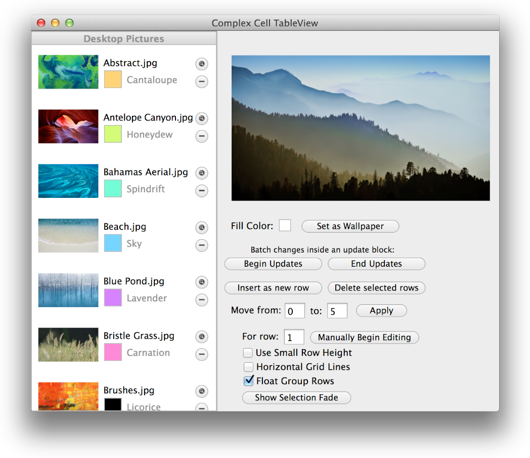 In contrast, the left area of the window shown in Figure 1-2 contains a complex table view in which each row consists of an image, some text, a custom color view, and buttons. Much, if not all, of the complex table view shown here is made using standard AppKit view objects that are arranged in a custom subclass of NSTableCellView. (The implementation of this table is also contained in the TableViewPlayground: Using View-Based NSTableView and NSOutlineView sample project.)
