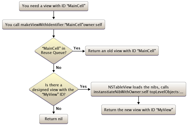 Because table view cells are instantiated from within the NSTableView instance in the Interface Builder editor, each cell is treated specially, as if it were its own nib. Each cell view has an owner. By default, a cell view’s owner is the table view’s default owner, which is usually the table’s delegate.