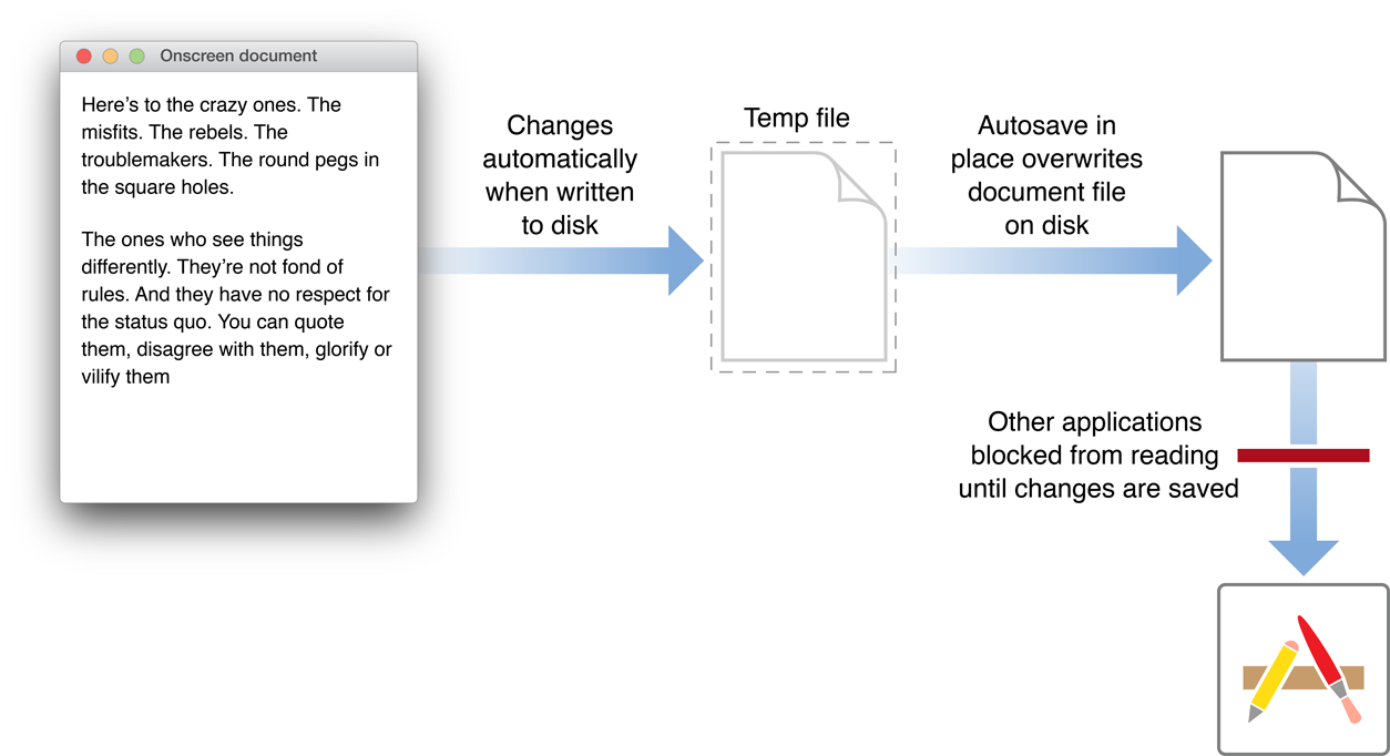 Automatic document saving is supported by the implementation of autosaving in place. Autosaving in place and autosaving elsewhere both protect against the user losing work due to app crashes, kernel panics, and power failures. However, autosaving in place differs from autosaving elsewhere in that it overwrites the actual document file rather than writing a new file next to it containing the autosaved document contents. (Autosaving in place performs a safe save by writing to a new file first, then moving it into the place of the document file when done.) Autosaving in place is illustrated in Figure 5-1.