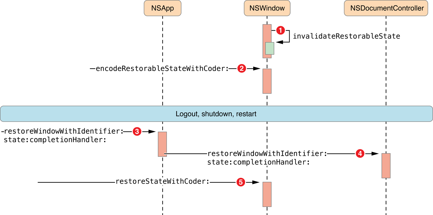 encodeRestorableStateWithCoder:message, and the window encodes identification and status information into the passed-in encoder.When the system restarts, Cocoa relaunches the app and sends the