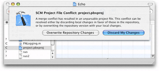 Before you commit your changes to the repository, refresh the status of the project to determine whether conflicts exist. In Xcode, choose SCM > Refresh Entire Project. If the SCM group in the Groups & Files list doesn’t contain files with a status of C, you can commit your changes. Otherwise, you must resolve the conflicts. See Resolving Conflicts for details.