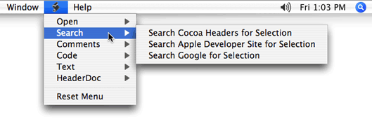 The default menu definition files add items to the User Scripts menu that let you open files, perform searches, add comments to your code, sort text, and even add HeaderDoc templates that can help you document your header files. And you can use these files as examples to help write additional menu definitions.
