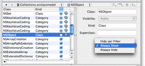 Hiding allows you to override the filtered state of a class (or protocol, or category). You can specify that an element should follow the filtered setting, or be either always shown or always hidden. You can set the hiding state using the browser view, in either the Hidden column in the property pane or using the pop-up menu in the detail pane, as shown in Figure 11-6 .