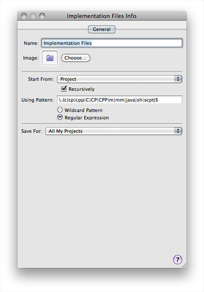 *.nib. Any files with.nibin their name are included in this smart group. The Simple Regular Expression Smart Group, on the other hand, uses the regular expression\.(c|cpp|C|CPP|m|mm|java|sh|scpt)$to collect all implementation files ending in any one of these suffixes, regardless of the case of the filename and extension. For more information on regular expressions, see the POSIX specification.Save For menu. Determines the scope for which this smart group is defined. You can have the smart group appear in all your projects, or you can specify that the smart group be specific to the current project.