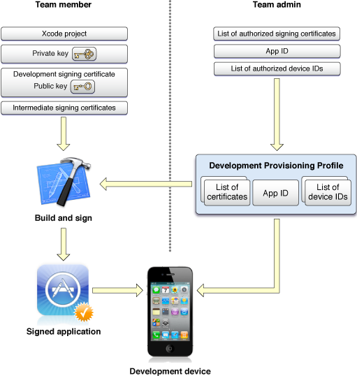 Regardless of which platform you are developing for, everyone on the team should understand the code signing process. This section describes the assets that are needed to sign an app and authorize it to run on a device, and then explains how people on the team acquire the assets they need to sign apps. Some of these assets should be created now as you organize your team; the rest are created each time you start a new project.