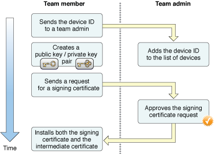 To get a signing certificate, a team member uses Xcode to request a signing certificate. Xcode automatically creates a new public and private key and requests that a new development signing certificate be created for the team member. After a team admin receives and approves the certificate request, the team member can use Xcode to automatically install the required pieces into the keychain.