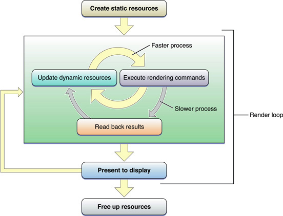 The inner rendering loop alternates between modifying dynamic resources and submitting rendering commands. Enough work should be included in this loop so that when the application needs to read or write to any OpenGL object, the graphics processor has finished processing any commands that used it.