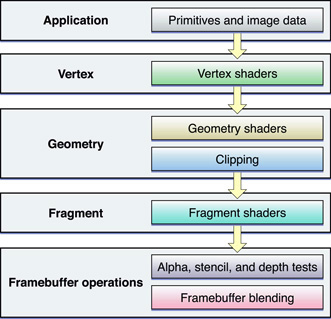 Starting with OpenGL 2.0, some stages of the OpenGL pipeline can be replaced with shaders. A shader is a program written in a special shading language. This program is compiled by OpenGL and uploaded directly into the graphics hardware. Figure 12-2 shows where your applications can hook into the pipeline with shaders.