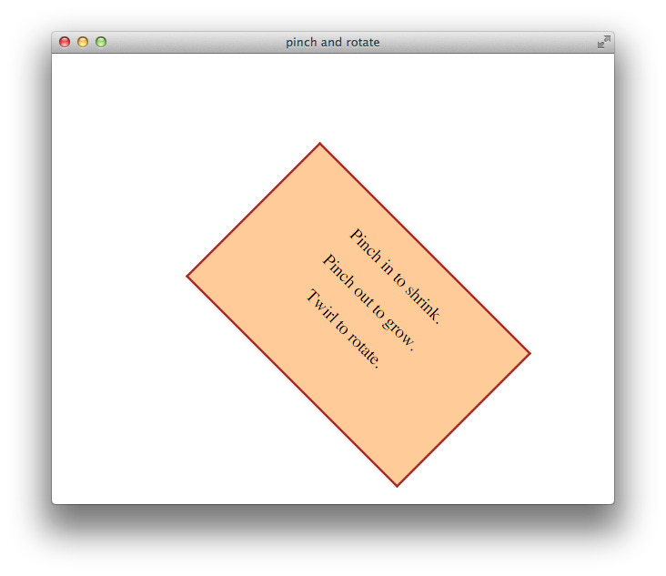 The example in Listing 8-3 first defines the style of the element to manipulate using CSS. The example then declares three JavaScript functions: one function to set the element’s scale and rotation dynamically during a gesture; a second function to preserve the element’s current scale and rotation when the gesture ends; and a third function to install the first two functions as event listeners. Finally, the example uses HTML to create an element, give it content, and call the function that installs the event listeners on page load. Figure 8-3 illustrates the result.