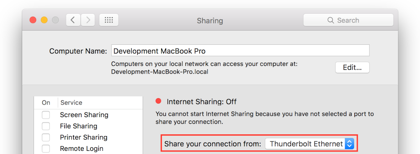 7. Choose the network interface that provides your Internet connection, such as Thunderbolt Ethernet.