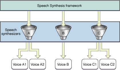 Note that, in general, your application does not need to know which speech synthesizer it is using or with which speech synthesizer a given voice is associated. However, some speech synthesizers provide special capabilities in addition to those provided by the Speech Synthesis framework. For example, a speech synthesizer might allow you to select an option to speak all numbers in a nonstandard way, such as digit-by-digit. For these circumstances, the Speech Synthesis framework provides APIs that allow you to determine which synthesizer is associated with a voice and provides hooks that allow your application to take advantage of synthesizer-specific capabilities.