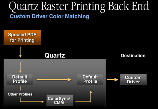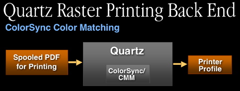 Quartz is also used to rasterize this spooled PDF at the printing back end. From the color management perspective, we have two options here. The first option is to use ColorSync for color matching. In this case, all color data from the spooled PDF is converted to the printer profile (Note: there is no device data in the spooled PDF).