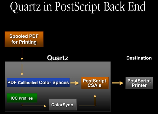 ColorSync is also involved in the PostScript back end. From the color management perspective, our goal here is to convert the color spaces contained in the spooled PDF to PostScript color space arrays (CSAs). Quartz has the internal capability to convert PDF calibrated color spaces directly to PostScript CSAs. All ICC profiles will be converted to PostScript CSAs using ColorSync.