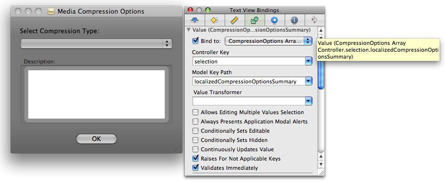 Establishing this binding in Interface Builder is equivalent to programatically sending the localizedCompressionOptionsSummary message to the currently selected QTCompressionOptions instance and displaying the returned string in the text view. We know what the index is for the currently selected item because of the above Selected Index binding.
