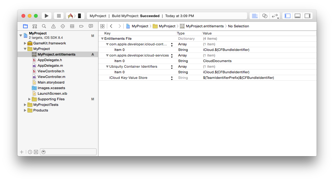 • Certain capabilities require a code signing entitlements file. Xcode manages the creation of this file automatically when you adjust a target's capabilities.