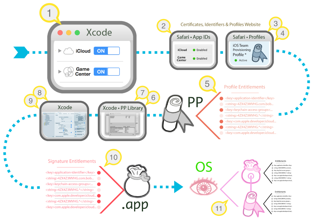 The following are relevant notes regarding Xcode's use of code signing entitlements files: