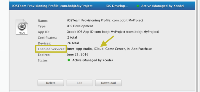 • When a Capability is toggled on the project’s target, Xcode automatically downloads and installs into its profile library an updated provisioning profile reflecting that change.